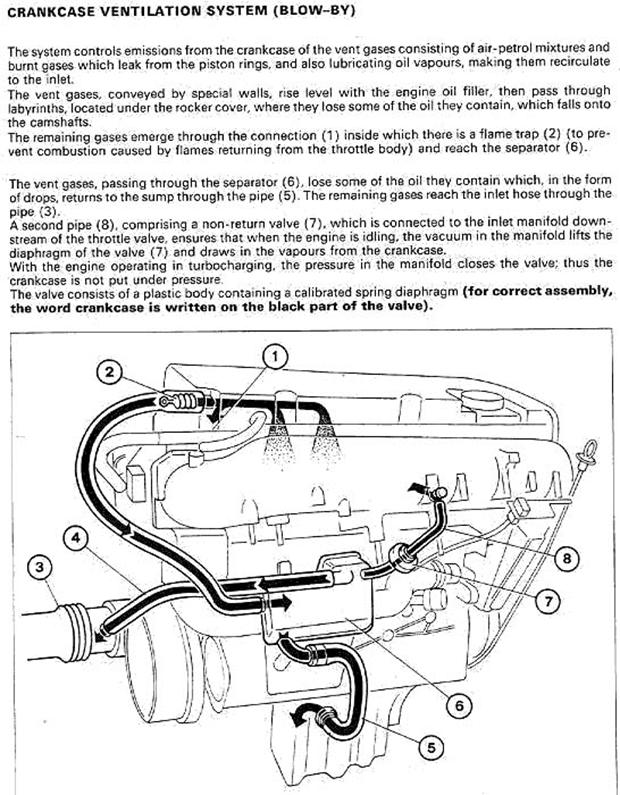 Crankcase gasses exit from the cam cover (1) through a flame trap (2)
